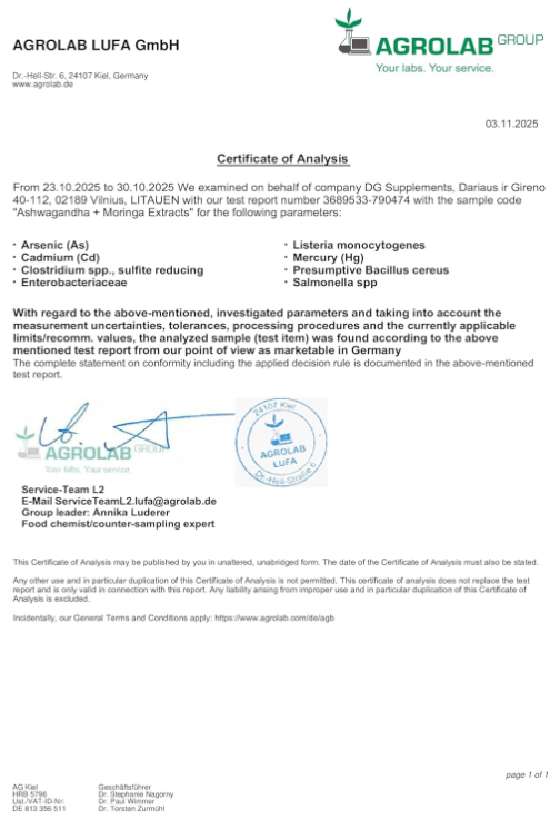 - Katra kapsula satur 250 mg ašvagandas 20:1 saknes ekstrakta ( 5000 mg ekvivalents) un 250 mg moringas 10:1 lapu ekstrakta ( 2500 mg ekvivalents), kas nodrošina sabalansētu atbalstu vispārējai labsajūtai.